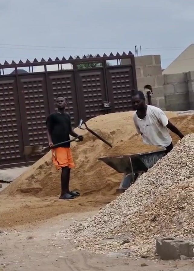 Two men are working at a construction site. One man wearing a black shirt and orange shorts is using a shovel to fill a wheelbarrow with sand. The other man, wearing a white shirt, is pushing the wheelbarrow up the sand hill. There is a large pile of gravel and a brown metal gate in the background. The sky is overcast.