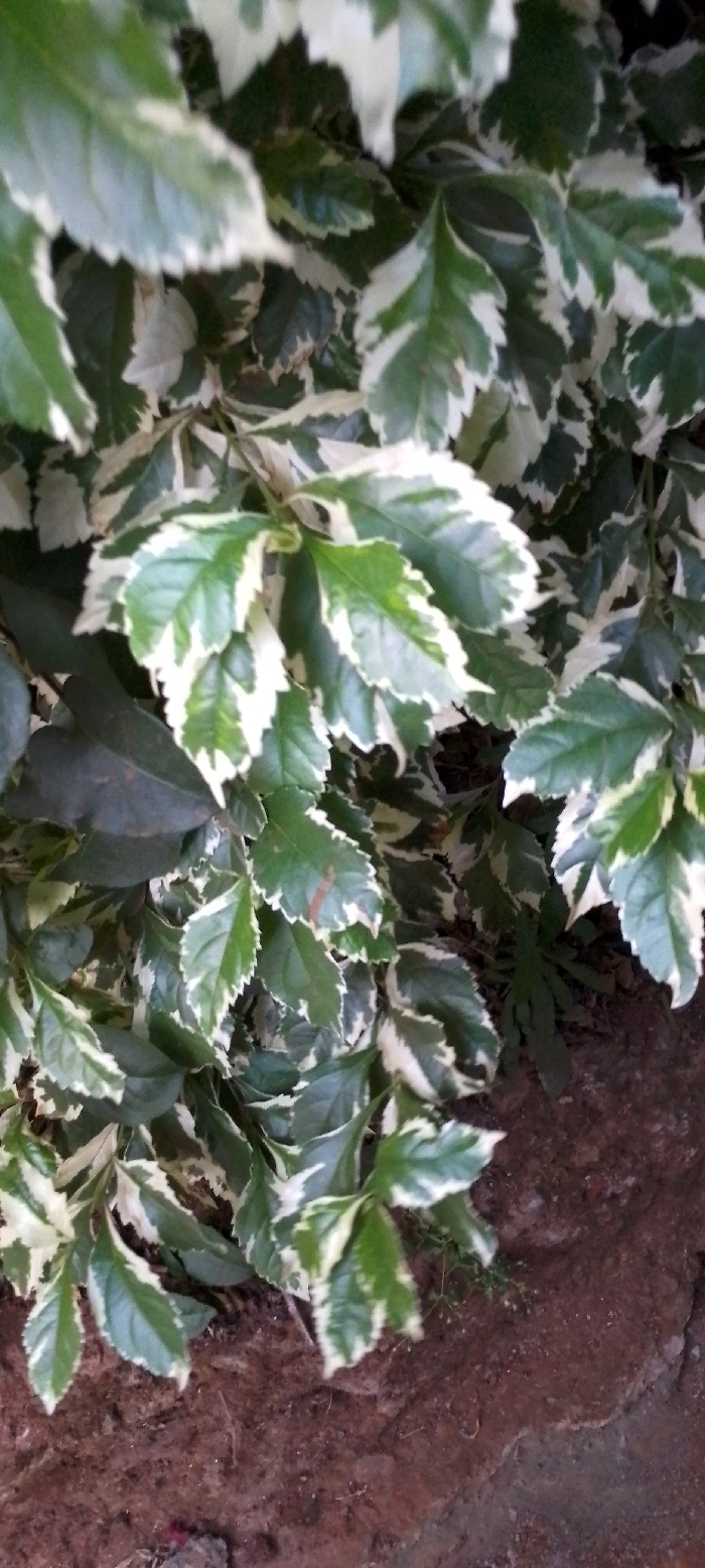 A close-up shows vibrant green and white variegated leaves densely clustered