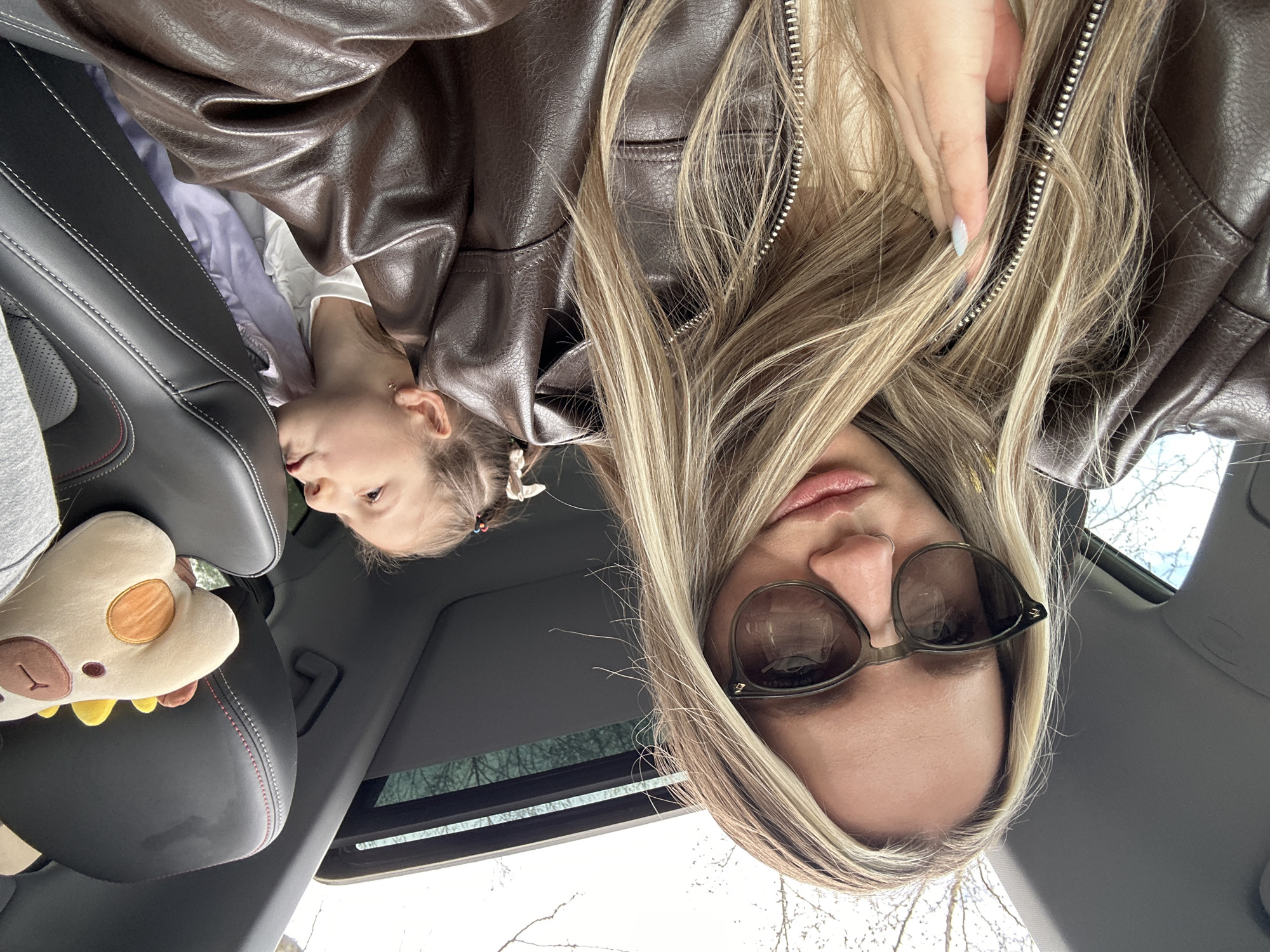 The scene depicts the interior of a vehicle in Başakşehir, Turkey, during daytime under an overcast sky, with bare tree branches visible through an open sunroof. An adult female dominates the foreground, positioned as if taking a selfie. She has long, straight, blonde hair with highlights, wears dark-framed sunglasses, and a visible nose ring on her left nostril. Her left hand, showing light-colored, elongated fingernails, rests near her chest. She is wearing a dark brown, zippered jacket over a lighter-colored garment. To the right and slightly behind her, a young female child is partially visible, seated in a rear passenger seat. The child has light-colored hair secured with colorful hair ties, wears a white ruffled top beneath a light purple layer, and looks upward and to the right with puckered lips. A light-colored plush toy, featuring brown, yellow, and orange accents, rests on the seat next to the child. The car interior features dark-colored seats with visible red and white contrast stitching.