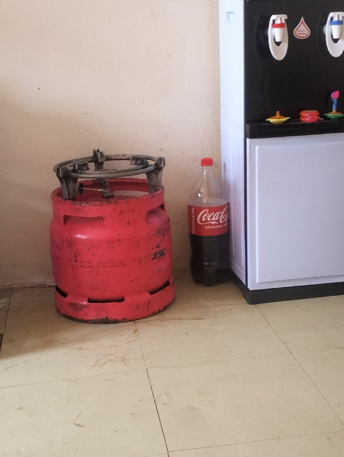 The scene depicts an indoor utility or kitchen area in Nairobi, Kenya. The flooring is composed of light-colored square tiles with dark grout lines, showing visible dirt and wear. The wall is a light beige or off-white, with minor surface imperfections and stains. In the left foreground, a worn, red LPG gas cylinder, consistent with a 6kg capacity, rests on the tiled floor. The cylinder shows signs of chipped paint, rust, and accumulated dirt. A grey metallic cooking stand is placed directly on top of the gas cylinder. To the right of the gas cylinder, a clear plastic bottle of "Coca-Cola Original Taste," approximately half-full of dark liquid, stands upright on the floor with its red screw cap. Further to the right, a two-tone water dispenser is positioned against the wall. The upper section is black, featuring two spigots: a red one for hot water and a blue one for cold. A red label reading "Be Careful Hot Water" is affixed between the spigots. The lower section of the dispenser is white, resembling a cabinet. Four small, colorful toy spinning tops—one yellow, two red, and one green/pink—are arranged on a white ledge extending from the water dispenser. No individuals are present in the image.