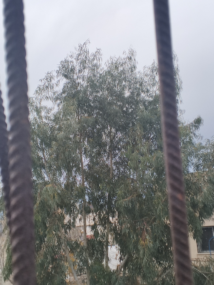 The image displays an outdoor scene in الشيخ حسين قرية, Jordan, viewed through two vertical, dark, rusted, twisted metal bars positioned out of focus in the immediate foreground. A large, densely foliated tree, characterized by numerous long, slender, light green leaves (consistent with Eucalyptus species), dominates the central and middle ground. The sky above the tree appears uniformly light gray, indicating overcast conditions. Through and beneath the tree's foliage, several distant structures are visible. On the right, a light-colored building, possibly beige or cream, features a dark, rectangular window on its upper section, with a blue object affixed below it. To the left, indistinct light-toned walls and areas covered by white tarpaulins or sheets are discernible. No individuals, animals, or discernible activities are present in the scene.