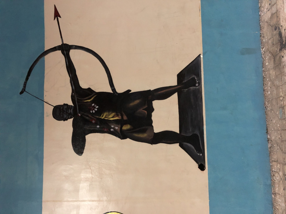 A mural depicts a dark-skinned man with a bow and arrow. He's drawn back the bowstring, ready to release. The man is adorned with white floral markings on his torso. He appears to be standing on a dark, rectangular platform. The mural is painted on a surface with a tricolor background consisting of blue, white, and beige stripes. The right edge of the mural meets a grey, textured wall.
