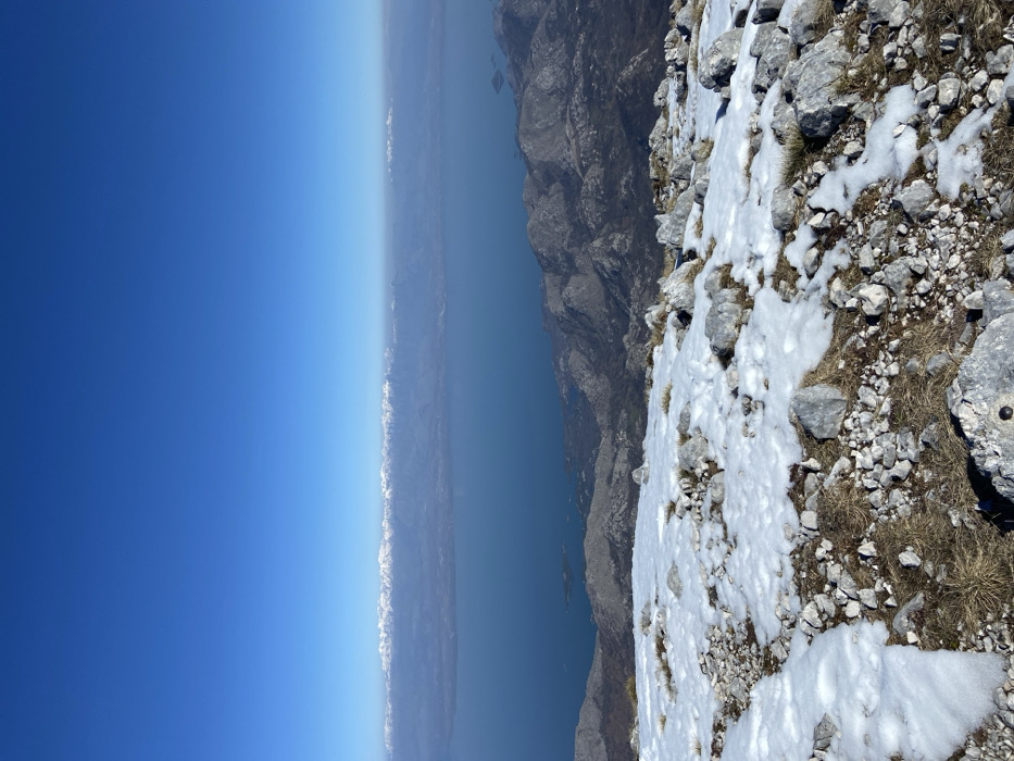 The image displays an expansive panoramic landscape viewed from a high elevation in the vicinity of Mali Mikulići, Montenegro. The foreground consists of rugged, light grey rocky terrain, featuring numerous loose stones and scree, interspersed with irregular patches of white snow. Sparse, dry, brownish-yellow grass is visible between the rocks and snow. A rock with a circular dark marking is partially visible at the bottom center. The midground reveals descending, predominantly grey and brown rocky mountain slopes leading towards a large body of water. Irregular coastline and smaller dark landmasses within the water are discernable closer to the viewer. The background is dominated by the vast, calm, deep blue surface of what appears to be Lake Skadar, extending to a distant, hazy shoreline. Beyond the lake, a long, distinct range of snow-capped mountains stretches horizontally across the horizon under a clear, vibrant blue sky. The scene is illuminated by bright natural daylight. No individuals, animals, or active interactions are present within the frame.