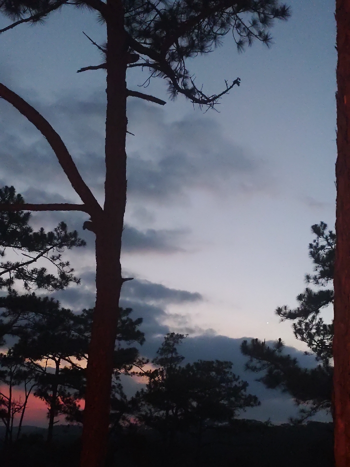 The image displays a forested landscape at dusk, located in Lạc Dương, Vietnam. The scene is dominated by the dark silhouettes of coniferous trees, specifically pines. A large, prominent pine tree trunk stands vertically in the left-center of the frame, extending from the bottom edge towards the top, with several branches extending outwards. A partial tree trunk is visible along the far right edge. The sky occupies the upper portion, exhibiting a gradient of colors characteristic of twilight: deep blue-gray at the top transitioning to lighter blues and purples, with a noticeable band of orange and pink hues near the horizon on the lower left, indicating a sunset. Irregularly shaped, dark gray and white clouds are scattered across the sky. The lower third of the image shows the dark, indistinct silhouettes of additional trees and a distant, undulating horizon line. No human individuals, animals, man-made structures, or specific actions are discernible within the frame.