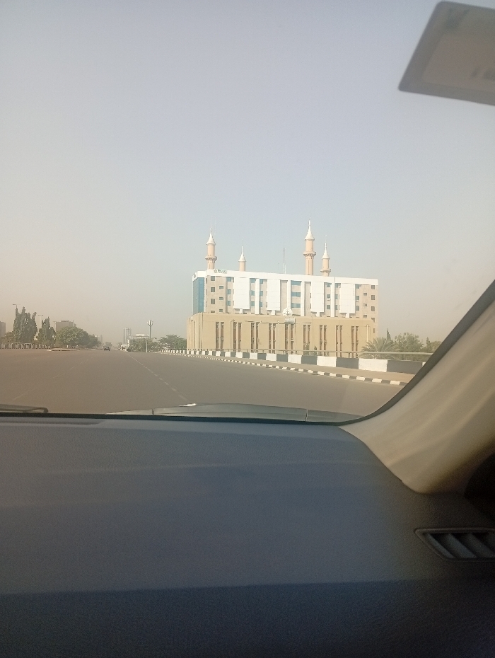 The image depicts a forward-facing view from the interior of a vehicle, capturing an urban road scene in Abuja, Nigeria