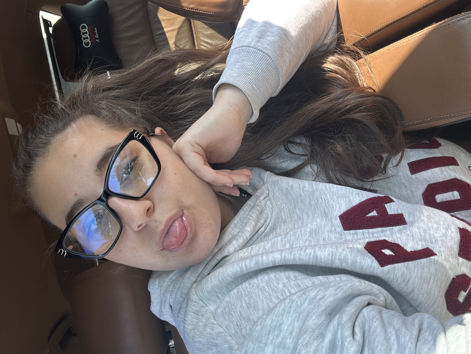 The image depicts a close-up selfie of a single individual, a female, seated inside what appears to be the interior of a vehicle. Her long, dark brown hair is pulled back, and she is wearing black-framed glasses with gold-colored accents on the temples. Her left hand is resting on the side of her face/jaw. She is actively posing with her tongue extended slightly from her mouth. Her attire consists of a light grey hooded sweatshirt (hoodie) with large, maroon/burgundy chenille lettering on the front, partially visible as "PAR" and "STORL" or similar. The interior of the vehicle features brown leather upholstery, visible on the seat behind her and to her right. A black automotive neck pillow with the "Audi" logo and the name "A. Rachov" in white lettering is positioned on the seat behind the subject's right shoulder. Sunlight illuminates the scene, casting reflections on the glasses and highlighting parts of the car interior and the individual's hair. The specific location in the city of Marinka, Bulgaria, cannot be determined from the visual information present in the image. The scene is confined to the interior of a vehicle.