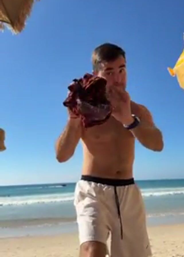 A shirtless man in light-colored shorts stands on a sunny beach with a red and black shirt in his hand