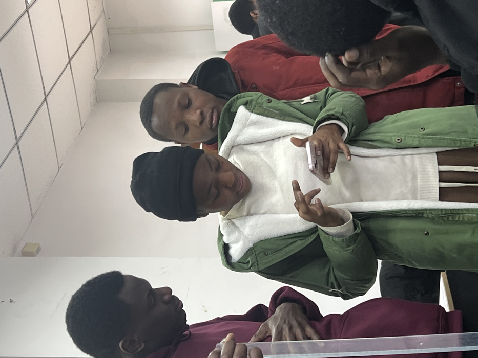 Several young men are grouped together indoors