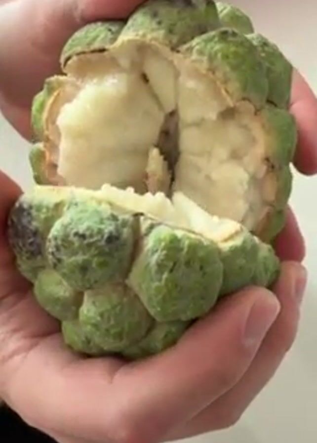 two hands opening a ripe custard apple, revealing its creamy, segmented interior and black seeds