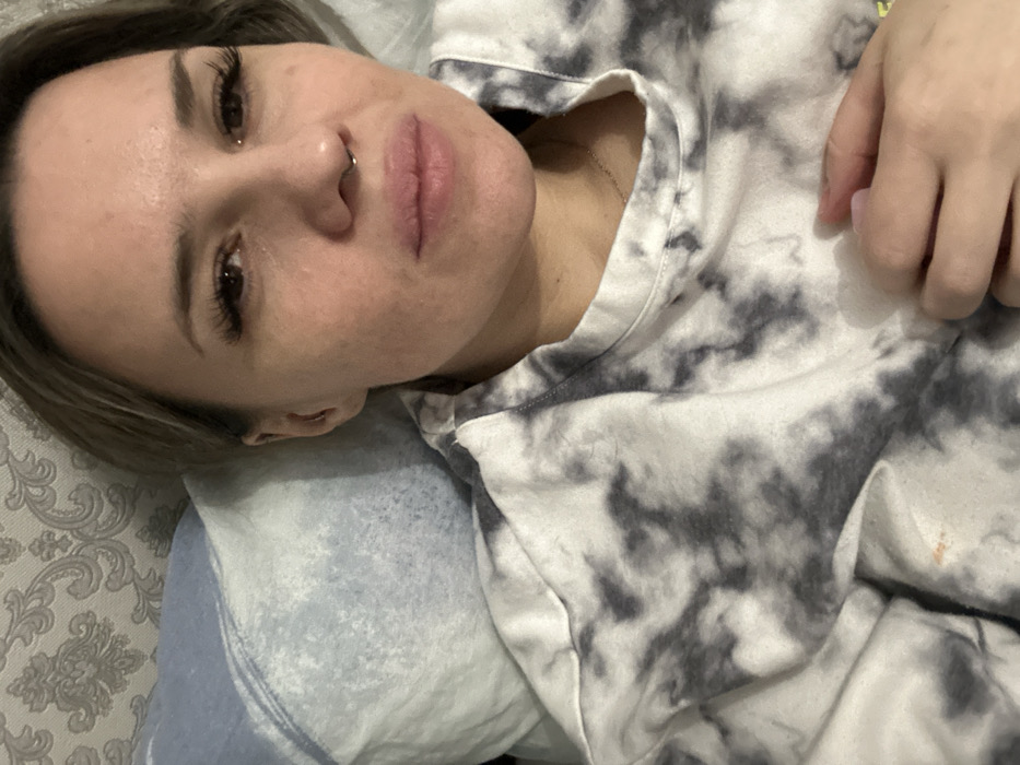 The image depicts a close-up, overhead shot of an adult female, identified to be in Rostov-on-Don, Russia. She is lying down, looking directly into the camera. Her hair is light brown or blonde, parted to the side. Her face shows natural skin texture, with prominent eyelashes and a small, silver-toned septum piercing. Her lips are full, and her expression is neutral. She wears a white and gray tie-dye long-sleeve top, with a thin chain necklace visible around her neck. Her right hand, exhibiting light pink nail polish, rests on the upper part of her chest. A light blue and white patterned pillow is visible behind her head and left shoulder. The background features a light-colored wall with a subtle, repeating damask pattern. A small, faint orange-brown stain is present on the front of her tie-dye top, below her right shoulder area.