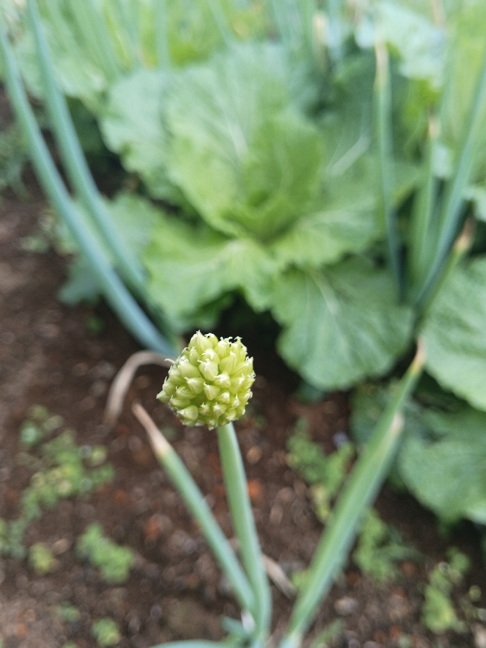 A close-up view displays a light green, spherical flower head, composed of numerous small, tightly packed buds, situated prominently in the center foreground. This flower head is supported by a slender, vertical green stem rooted in dark brown soil. Small, scattered green plant sprouts are visible on the soil surface. In the softly focused background, large, crinkled green leaves of cultivated plants, consistent with cabbage or similar Brassica species, are present. Additional out-of-focus green stalks, resembling those of the foreground plant, are scattered throughout the background. No human subjects or discernible actions are depicted. The scene is set in a cultivated garden or field within the city of Ngọc Tụ, Vietnam.