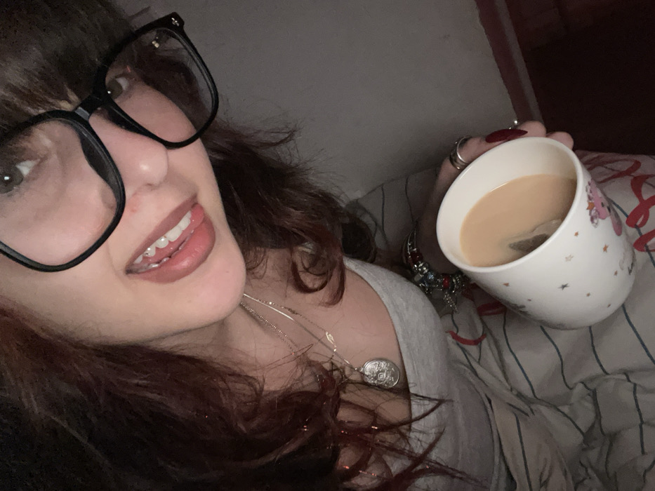 A woman with dark hair and bangs wearing large, black-rimmed glasses smiles with her tongue slightly visible. She has on a grey shirt and is wearing a necklace. She holds a white mug with colorful stars and a unicorn on it. The mug contains a beige liquid, presumably tea, with a tea bag steeping inside. Several rings adorn her fingers, and a colorful charm bracelet is on her wrist. The scene is set on a bed with striped bedding.