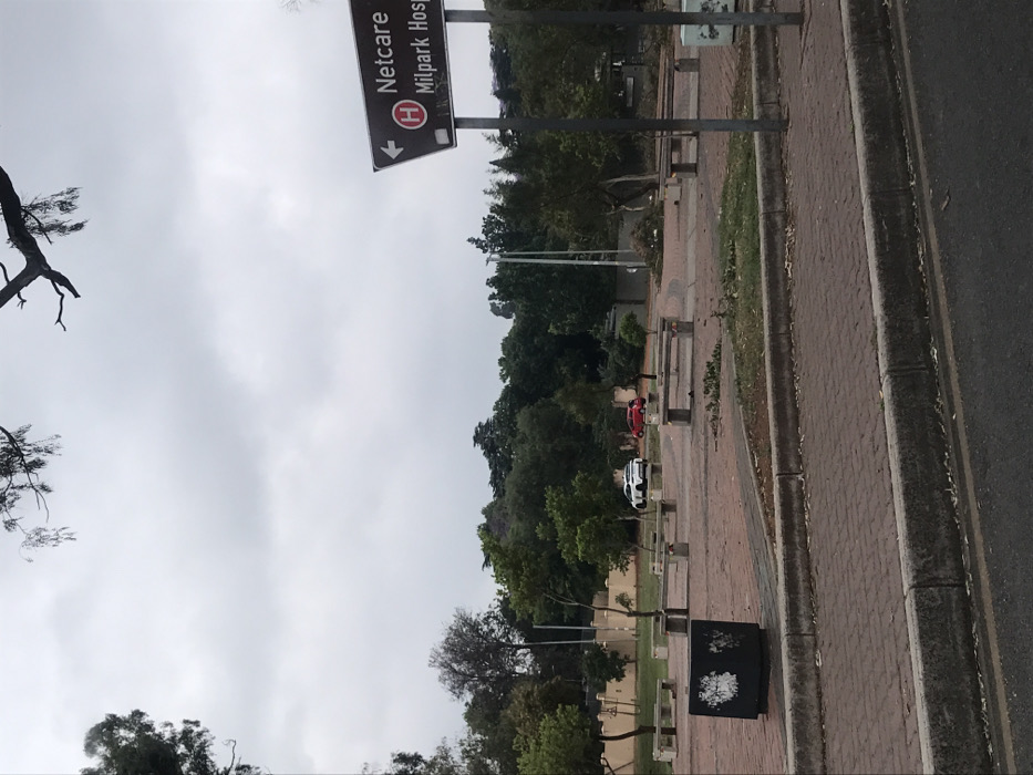 The image depicts a deserted outdoor public area adjacent to a roadway, located in the vicinity of Netcare Milpark Hospital in Johannesburg, South Africa
