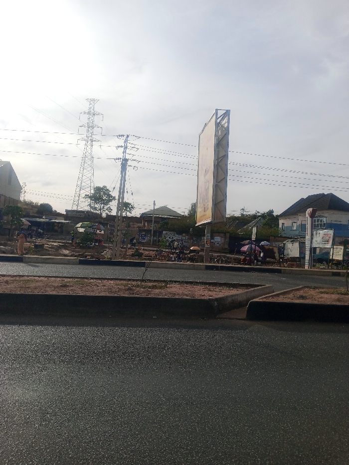 The image depicts an urban street scene in Jos, Nigeria, under a bright, overcast sky. In the immediate foreground, a dark grey asphalt road, appearing damp, is visible, separated by a low concrete curb from a reddish-brown dirt median. In the midground, towards the left, a large, metallic lattice electricity transmission tower stands prominently, with multiple power lines extending horizontally across the frame. A wooden utility pole, slightly inclined, is also visible with attached wires. Adjacent to the road and behind the median, a bustling market area is present on an uneven dirt surface. This area contains numerous individuals, some of whom are standing or walking, while others are sheltering under small, colorful umbrellas, likely attending to market stalls displaying various goods. One individual in light-colored clothing is visible walking on a dirt path to the far left. To the right of the market activity, a tall, freestanding billboard structure with a light-colored advertising panel is positioned. Further to the right, a light-colored building with a dark roof and another sign structure are visible, indicating further commercial or residential presence. The background consists of various buildings with different roof types, scattered trees, and rising terrain on the left horizon.