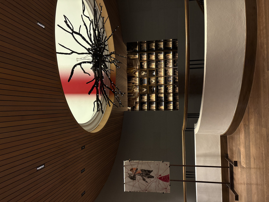 n architectural interior with a focus on art installations. A large, round window with a bare branch sculpture is on the left. Next to it, a grid of small, illuminated boxes hangs. Below these, a framed piece of art on a stand features abstract, organic shapes with red accents. The background includes a light-colored wall with dark horizontal stripes and a curved section, suggesting a stairwell or multi-level space. The overall tone is modern and artistic, with a soft, ambient lighting.