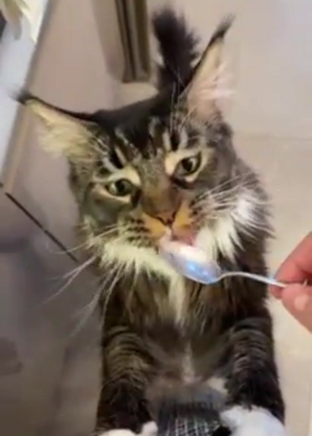 A medium shot captures a tabby cat being offered a spoonful of food by a person