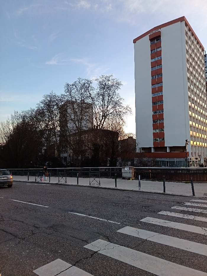 This image depicts an urban street scene in Toulouse, France, facing east towards the Mercure Toulouse Centre Compans Caffarelli hotel, located on Boulevard Lascrosses adjacent to the Canal de Brienne. The scene is illuminated by the low-angle sun of late afternoon or early evening, casting a warm glow on the right side of structures under a mostly clear blue sky with faint cirrus clouds. In the foreground, a cracked asphalt road with faded white crosswalk markings and a double solid white line adjacent to a dashed white line is visible. A dark grey two-door hatchback car, identifiable as a Peugeot 206 with a license plate partially visible as "DW", is present on the left side, angled away from the viewer, indicating movement. Parallel to the road, a concrete sidewalk is delineated by a series of black cylindrical bollards and a dark metal pedestrian barrier featuring X-shaped supports. One individual, dressed in a dark jacket and light trousers, stands stationary on the sidewalk near the barrier, holding a light-colored bag. Beyond the pedestrian barrier and a lower-level embankment, a dense line of leafless deciduous trees partially obscures several mid-rise buildings. The most prominent structure in the background is the tall Mercure Toulouse Centre Compans Caffarelli hotel, characterized by its white facade, distinctive vertical bands of orange-red recessed windows, and a grid of square balconies or windows on its right-facing side. The hotel's 'MERCURE' logo and a star emblem are visible near its roofline.