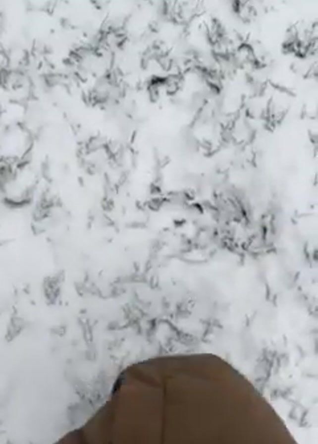 The camera angle shows a person walking on a thin layer of snow on grass. The person is wearing brown pants and black boots. The snow is partially covering the green grass, and the ground underneath is visible in patches. The camera perspective is from the person's point of view as they walk.