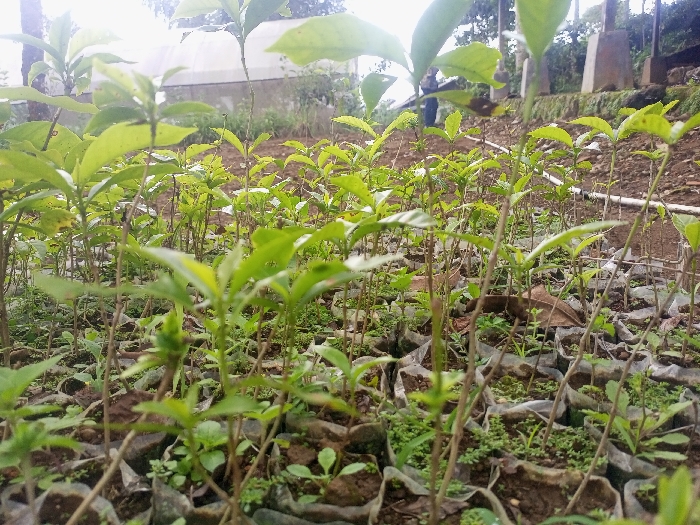 The scene depicts an outdoor plant nursery or cultivation area in Ciherang, Indonesia