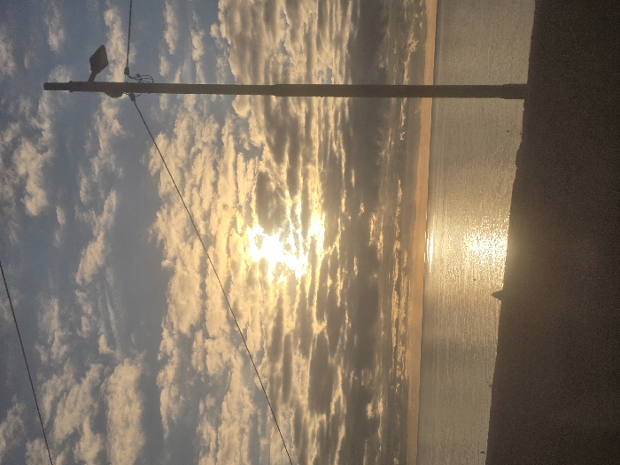 The image depicts a coastal scene in Èze, France, at either sunrise or sunset. The sky is partially covered with altocumulus clouds, illuminated from behind by a low sun positioned in the central-left, casting a bright glare across a calm body of water, likely the Mediterranean Sea, which occupies the middle ground. The foreground consists of a dark, indistinct landmass or beach, heavily shadowed. A tall, dark utility pole with a single streetlamp fixture stands vertically on the right side of the frame, extending from the bottom edge. Multiple thin, dark wires stretch horizontally across the upper sky, connecting to or passing near the pole. Two small, dark, human-like silhouettes are visible on the shadowed landmass near the water's edge, one in the center-left appearing to be seated or crouched. A small, dark, indistinct object is present on the water's surface to the left of the sun's reflection.