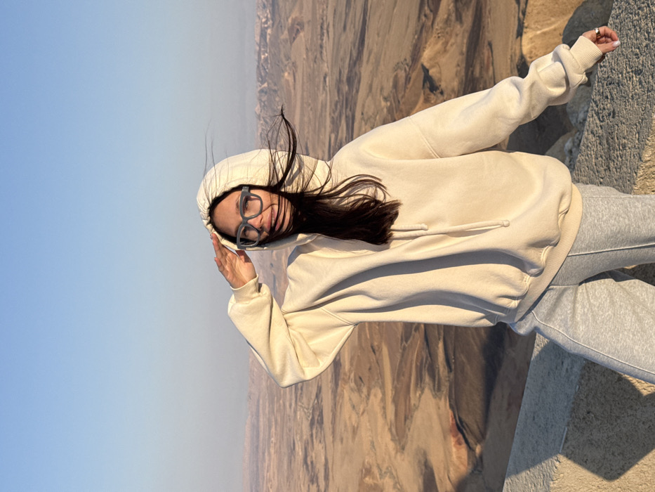 A female subject stands at a viewpoint overlooking the Ramon Crater in Mizpe Ramon, Israel. She wears a cream-colored hooded sweatshirt with the hood up, grey sweatpants, and grey-framed rectangular glasses. Her long dark hair, visible beneath the hood, is partially blown to the viewer's left. Her left hand is raised to her forehead in a shading gesture, and her right hand rests upon a grey concrete barrier. A silver-colored band is visible on her left ring finger. The subject exhibits a slight smile. The background consists of a vast, arid desert landscape, characterized by undulating hills and valleys in shades of tan and brown, extending under a clear, light blue sky. The scene is illuminated by natural light, suggesting either sunrise or sunset.