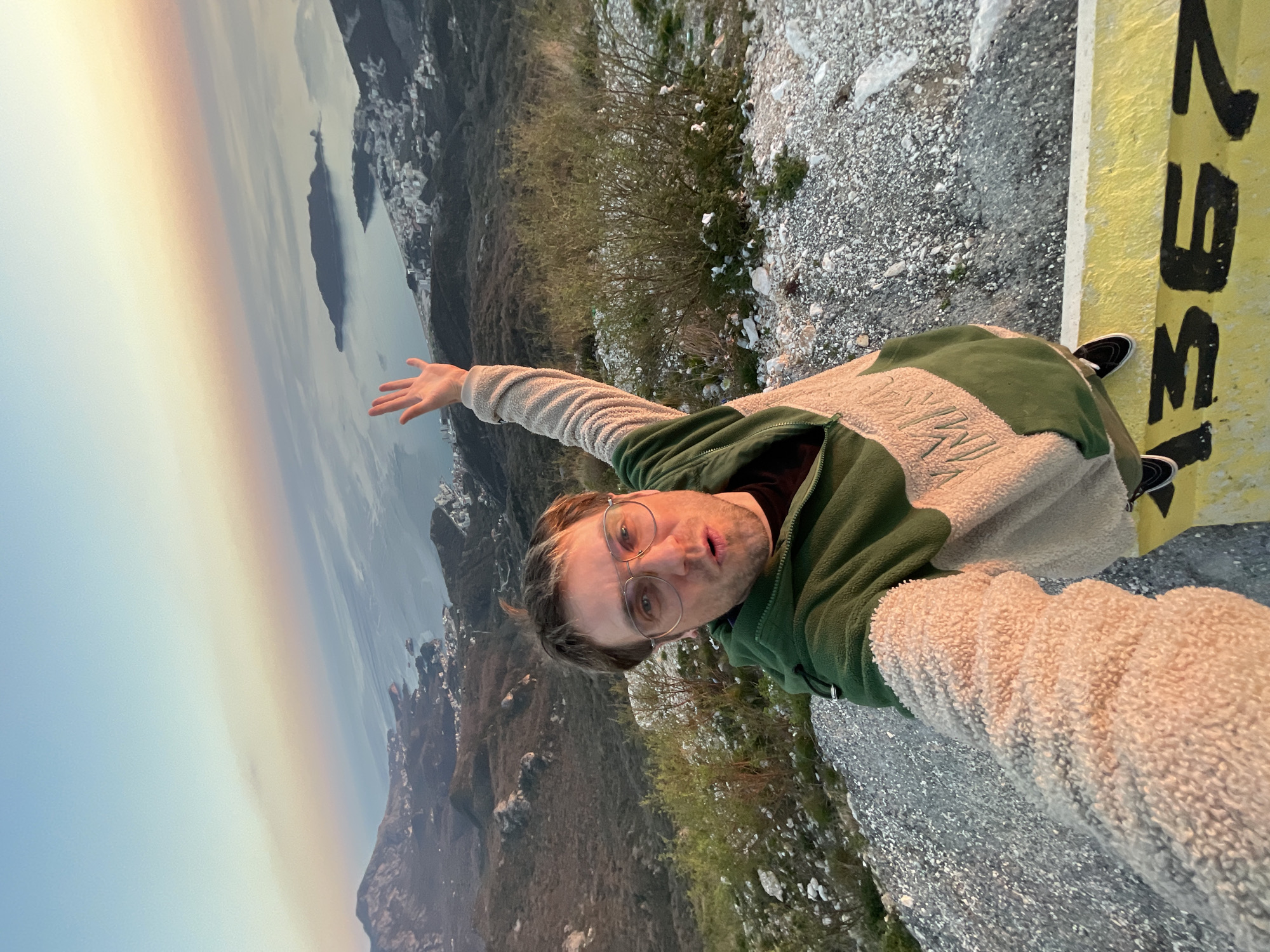 A selfie depicts a man wearing glasses, a green and beige jacket, and black shoes