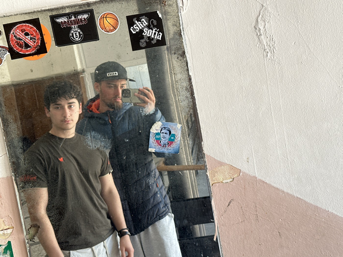 Two males are depicted in a mirror selfie taken indoors within a building in Dupnitsa, Bulgaria