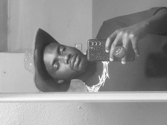 A black and white photo shows a man with a cowboy hat, wearing a necklace or shirt with lines. He is holding a cell phone in his hand. The phone is decorated with glitter and has a pop socket on the back. The photo is a selfie, likely taken in a mirror. The background features parts of a wall and a light fixture.