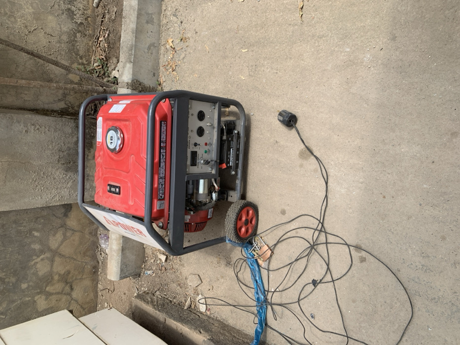 The scene is an outdoor ground-level view in Unknown, Nigeria, featuring a red and grey portable gasoline generator situated on a light grey concrete slab