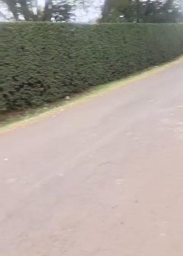 The camera moves along a paved road next to a long, thick, green hedge. Trees are visible behind the hedge. The sky appears overcast. A power pole and a dirt road are visible to the left of the hedge. There is some litter along the edge of the road.