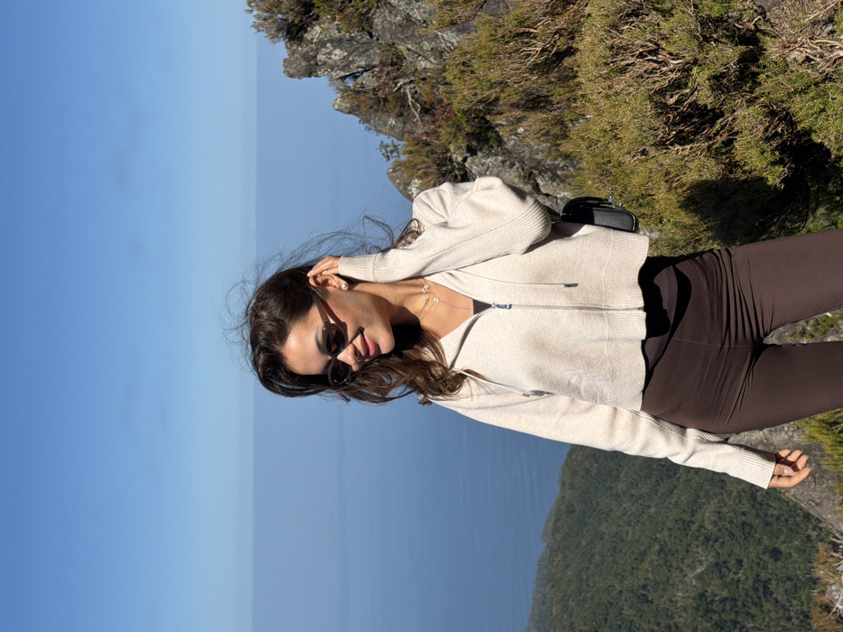 A female subject is depicted standing on a mountainous ridge in Porto Moniz, Portugal, under a clear blue sky on a sunny day. She is positioned slightly right of center, gazing towards the left with a smile, her left hand lightly touching her ear/hair. She wears dark sunglasses, a light beige cropped zip-up hoodie over a dark top, dark brown leggings, a layered necklace, and a small black shoulder bag. Her dark hair is loose and appears windblown. The background features a vast blue ocean meeting the horizon, with steep, verdant mountain slopes descending to the left. To the right, dark rock formations with sparse, green-brown vegetation are visible. The immediate foreground consists of low-lying scrub and rocky terrain.