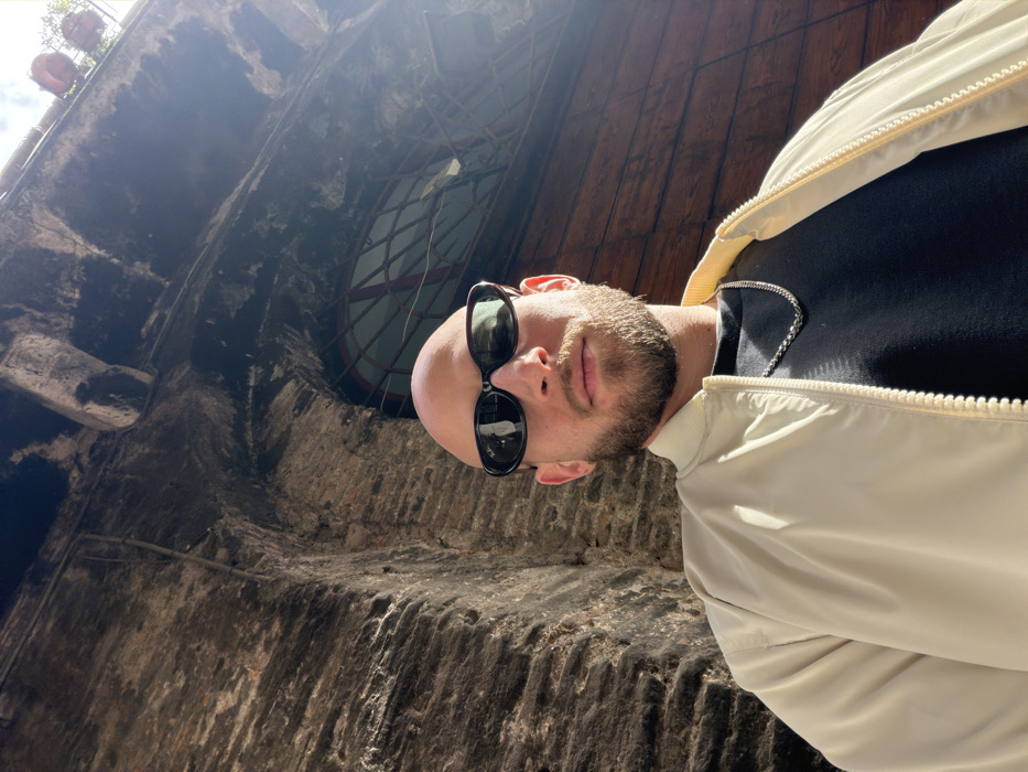 A male individual, bald and with a light brown beard, is presented in a low-angle, chest-up view. He wears dark oval sunglasses, a light beige zippered bomber jacket over a dark crew-neck shirt, and a silver-tone chain necklace. His expression is neutral as he looks directly at the camera. The background features a tall, multi-toned stone and brick building facade, displaying signs of age and weathering. An arched window with a dark metal security grid is visible in the upper right quadrant of the image. To the subject's right, a dark wooden panel door with vertical planks is partially visible. The scene is illuminated by direct sunlight, creating distinct shadows. This architectural setting is consistent with a historic urban street in Rome, Italy.