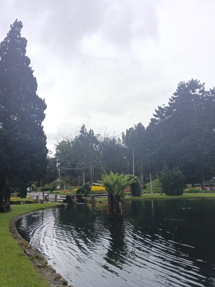 The image displays a landscaped park or garden environment in Matopos, Zimbabwe, under an overcast sky. A dark, calm body of water, likely a pond or small lake, occupies the lower and central portions of the frame, showing ripples on its surface. The left edge of the water features a manicured green grass bank. In the mid-ground, emerging from the water, is a cluster of broad-leaved green plants growing from what appears to be a tree stump or small island. Beyond the water, the scene is dominated by dense foliage. Tall, dark green coniferous trees frame the left and right sides, with a mixture of other green trees forming a dense backdrop across the mid-ground. Elevated garden beds featuring vibrant yellow flowers are visible behind the water, flanked by manicured shrubbery. A small, low bridge or crossing structure spans a narrow section of the water in the mid-ground. Further left, a paved path or road is partially visible, along with several orange traffic cones. In the distant background on the right, colorful, low-lying structures are faintly discernible. No people or animals are present in the scene.