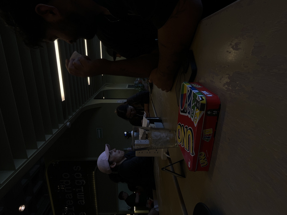 A group of people are gathered around a table. One man is seen from above with his hands clasped together near his face. At the table, there is a box of UNO cards, a glass of water, and electronic devices. Other individuals sit around the table facing in the same direction, and one man is wearing a pink cap. The background features a building with a lit staircase.
