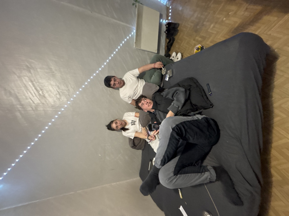 This image depicts an indoor scene in a room, presumed to be in Troyan, Bulgaria. Three young individuals are present. **People:** * A male individual is positioned in the foreground, lying on his back on a bed covered with a dark grey fitted sheet. He is wearing black socks, grey sweatpants with black side stripes, and a dark grey or black puffer vest over a long-sleeved dark shirt. His head is propped up slightly, and he looks towards the upper right of the frame with a neutral to slightly pensive expression. His left arm is bent, holding a black smartphone. * Behind him, towards the left, a female individual is seated upright on the bed, leaning against a dark cushion. She is wearing a white t-shirt with a dark graphic design on the front. Her hair is dark and pulled back. She appears to be looking towards the left, with her mouth slightly open. * To the right of the female, another male individual is seated on the bed, also leaning against a dark cushion. He is wearing a white t-shirt and light green or grey trousers. His left arm is resting on his knee, and his right hand holds a lit cigarette between his index and middle fingers. He is looking downwards and slightly to the left. **Objects and Environment:** * The primary furniture is a large bed with a dark grey fitted sheet, occupying a significant portion of the lower frame. * Various small items are scattered on the bed near the seated male on the right, including a small metallic object, two small rectangular white packages, and a lighter. A cigarette is visible in the hand of the seated male. * The wall behind the individuals is a uniform light grey, possibly concrete or painted. A string of small white LED lights runs diagonally from the upper left corner down towards the lower right corner of the wall. * On the right side of the room, below the line of LED lights, a white wall-mounted heater with horizontal fins is visible. * Below the heater, two pairs of dark shoes are visible on the floor. * The floor is made of light-colored wood, arranged in a herringbone pattern. * Another black cylindrical object, possibly a vape pen, lies on the bed in the foreground, near the feet of the male lying down. * A crumpled piece of white paper is also visible on the bed in the lower left quadrant. * The overall lighting is dim, augmented by the LED string lights.