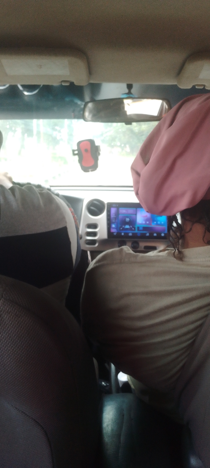 The image depicts the interior of a vehicle, observed from a rear passenger seat. Two individuals occupy the front seats. The individual on the left, presumed to be the driver, is partially visible from the shoulders up, wearing a garment with grey and black horizontal sections. The individual on the right, in the front passenger seat, is seen from behind, wearing a light-colored, possibly beige or light tan, top, with curly hair visible below a pink head covering. The vehicle's interior features a beige headliner and two sun visors. A rearview mirror is centrally positioned. Attached to the windshield is a red and black mobile phone mount. The dashboard includes multiple air vents and a large, illuminated central infotainment screen displaying a graphical user interface with various colors and icons, suggesting navigation or multimedia content. The upholstery of the front passenger seat and a portion of the seat from which the image is taken, appear to be dark grey with a textured pattern. Through the front windshield, a bright, out-of-focus outdoor environment is visible, dominated by diffused light and blurred green shapes, consistent with trees or foliage. No specific structures or landmarks are discernible in the exterior view. The specific location within the city of Ogbogbo, Nigeria, cannot be determined from the visual information provided.