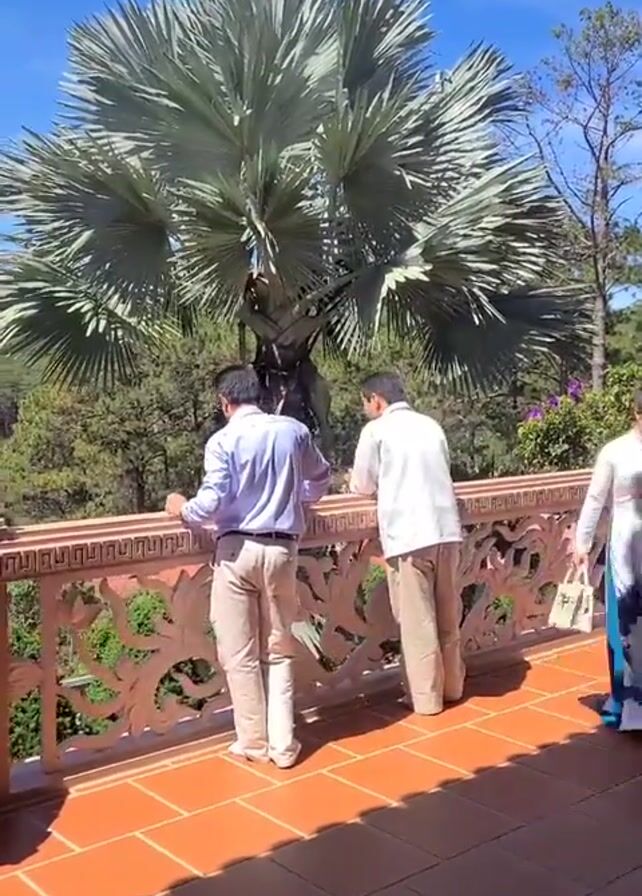 The video captures a bright, sunny day at what appears to be an elevated viewpoint. Two men, both dressed in light-colored shirts and khaki pants, are leaning on an intricately designed pink railing, looking out at a landscape of lush green trees. A large, distinctive palm tree with silvery-green leaves dominates the view, adding a tropical feel. The floor is tiled in terracotta. A woman in a white and floral dress walks into the frame from the right side. The setting seems serene and possibly part of a temple or resort. In the background, the clear blue sky enhances the overall vibrancy of the scene.