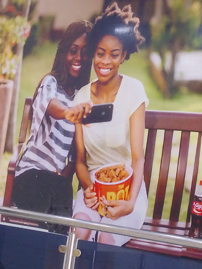 The image depicts an outdoor scene in Giginyu, Nigeria, showing two adult females of African descent seated on a brown slatted park bench. The female on the left, with long dark hair, wears a grey and white striped top and dark trousers; she extends her right arm, holding a black smartphone horizontally to take a selfie. She is smiling broadly, facing the phone. The female on the right, with dark curly hair, wears a light yellow short-sleeved top and a light skirt; she is holding a large red and yellow bucket, partially labeled "THE POT," filled with fried chicken pieces and French fries. She is also smiling broadly, looking towards the smartphone. A red Coca-Cola plastic bottle rests on the bench to her right. The background features blurred green foliage and potted plants, indicating a park or garden setting. In the foreground, a metallic handrail and a dark blue base are visible, suggesting this is a photograph of a larger display.