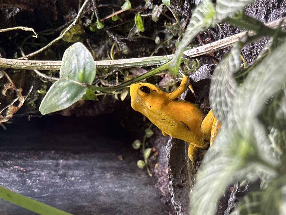 - "A bright yellow frog clings to a dark, textured surface beside a dark opening" by FM-2Bjlr1, licensed under CC BY 4.0