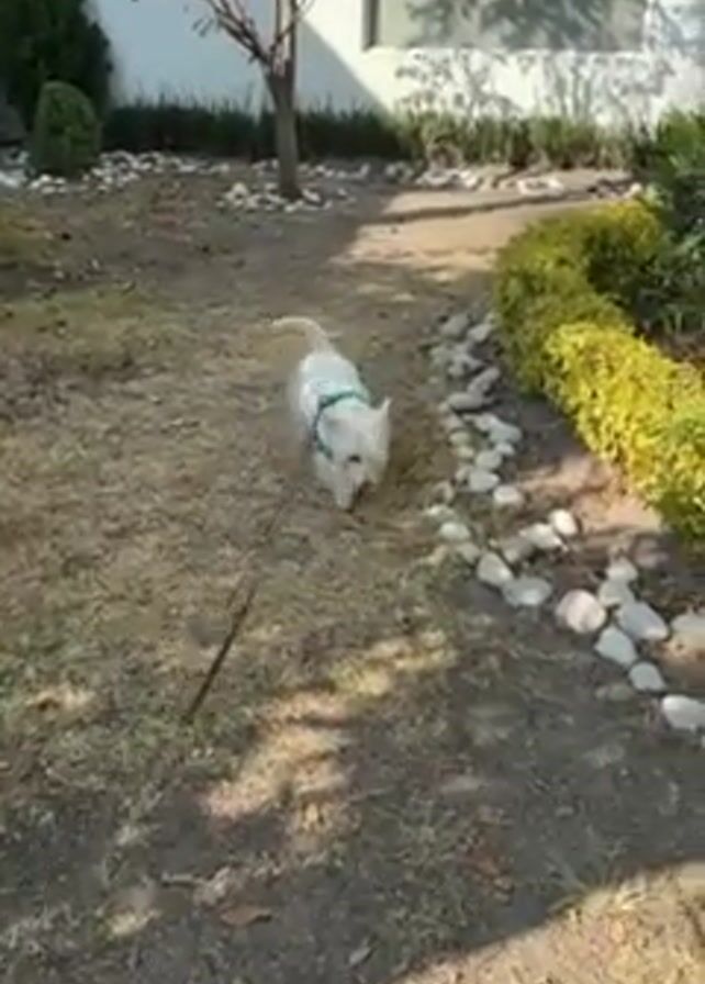 A small, white West Highland White Terrier wearing a white jacket and a green harness is walking on a leash through a garden. The garden has dry grass, small trees, bushes, and white decorative rocks. A shadow of a person holding the leash is visible on the ground. The dog is walking along a narrow dirt path next to the rocks and bushes. The background shows a house with white walls and windows. The scene is bright and appears to be outdoors in the daytime.