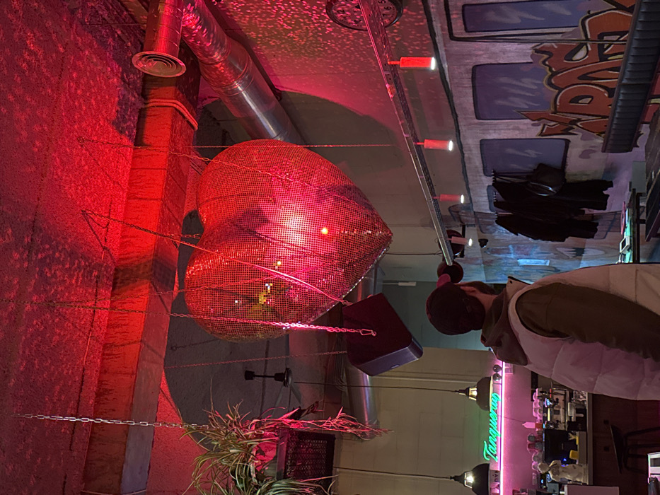 This image depicts the interior of a commercial establishment, likely a bar or club, located in Dnipro, Ukraine. The scene is characterized by dim, predominantly red illumination, creating a distinct ambiance. In the foreground-middle ground, a male individual is seen from behind, wearing a dark baseball cap, a dark long-sleeved garment, and a light-colored puffer vest. He is looking towards the right side of the frame. The central object is a large, heart-shaped disco ball, reflective and shimmering red due to the ambient light, suspended from the ceiling by multiple chains. To the left of the disco ball, a dark speaker box also hangs from the ceiling by chains. The ceiling itself is exposed, showing textured surfaces, visible ductwork, and a dark ceiling fan in the upper left. On the left side of the frame, a bar or counter area is visible in the background, featuring pendant lights with dark shades, an espresso machine or similar beverage equipment, small white decorative statues, and a green neon sign displaying the word "Tanqueray." A hanging plant in a dark basket is also present. The wall on the right side of the image features a mural with elements resembling train car windows with purple interiors and red graffiti text below. Hooks on this wall hold several dark coats and a black purse. Below the mural, dark, tufted bench seating is visible. Above the seating, a metal track light system runs horizontally, equipped with several small, cylindrical light fixtures, some emitting white light, others red. The red ambient lighting casts patterns across the ceiling and upper walls.
