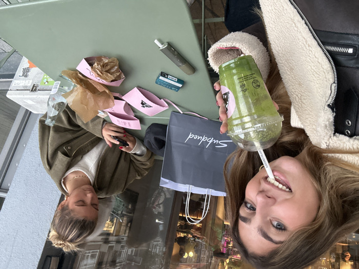 Two young adult females are seated at a light green metal outdoor table. The female on the left, with long brown hair, looks directly at the camera, smiling, and holds a transparent plastic cup containing a green liquid and a white straw. She wears a dark brown jacket with cream shearling lining. The female on the right, with blonde hair styled in an updo, is observed looking down at a black smartphone held in her hands. She wears an olive green jacket over a light-colored sweater. On the table are a grey shopping bag with "Subdued" branding, a black cap, a blue and white "TEREA" brand cigarette pack, a silver heated tobacco device with a white tip, several opened pink paper wrappers (some containing crumpled brown paper), and an empty clear glass water bottle. A utility box with stickers is partially visible to the far right. The background features a blurred reflection of an interior space through a large glass window and a plain grey building facade. This scene is situated on a street in Rotterdam, Netherlands, likely in a shopping district such as Lijnbaan, adjacent to a "Subdued" retail store.