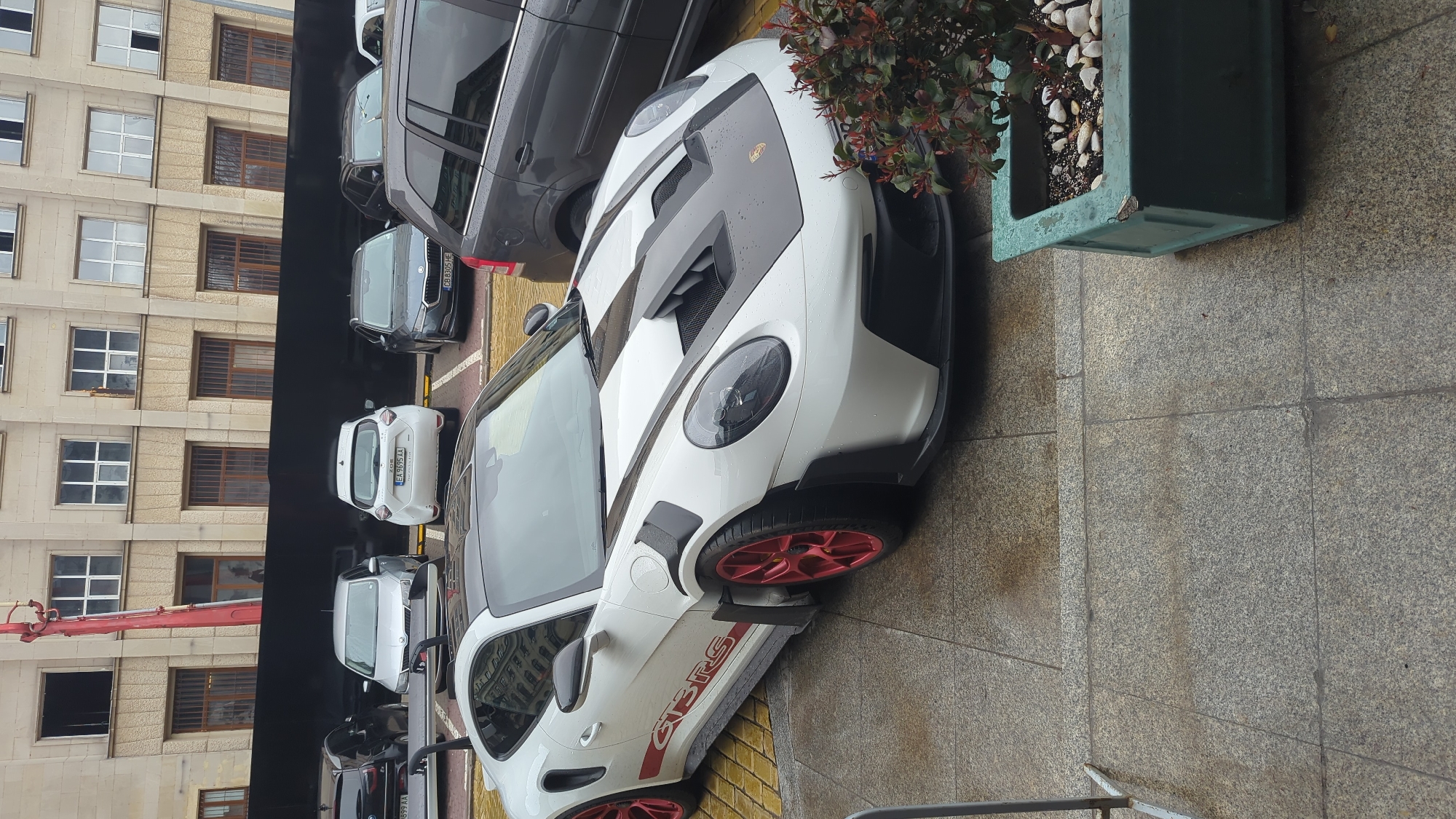 A white Porsche 911 GT3 RS is parked on a wet, grey granite-tiled surface, angled towards the right. The vehicle features a white body, a black carbon fiber hood with prominent central vents, a black roof, and black side air intakes behind the doors. It is equipped with red multi-spoke wheels and has a red "GT3RS" decal on its lower side panel. Water droplets are visible on the car's surfaces, indicating recent precipitation. In the immediate foreground, to the right, a rectangular green planter containing a small bush with reddish leaves and white decorative stones is positioned on the pavement. A thin, bent metal barrier is partially visible on the far left. Behind the Porsche, a parking area accommodates several vehicles. A white Renault Zoe electric car with Bulgarian license plate "EA 9695 AA" is visible, along with a silver Skoda Fabia and a dark grey Skoda Octavia Combi bearing the Bulgarian license plate "CB 8305 HE". These license plates identify the location within the Sofia region, Bulgaria. The background consists of a large, multi-story building with a light-colored, textured stone facade featuring prominent vertical pilasters and multiple rectangular windows. Some windows, particularly on the upper levels, appear to have broken or missing panes. A red construction crane's boom extends upwards from behind a black barrier situated between the parking lot and the building's base. The architectural style of the building and the specific license plate prefixes place this scene in central Sofia, Bulgaria, consistent with the area around the Council of Ministers building (the former Party House) near Ploshtad Nezavisimost (Independence Square).