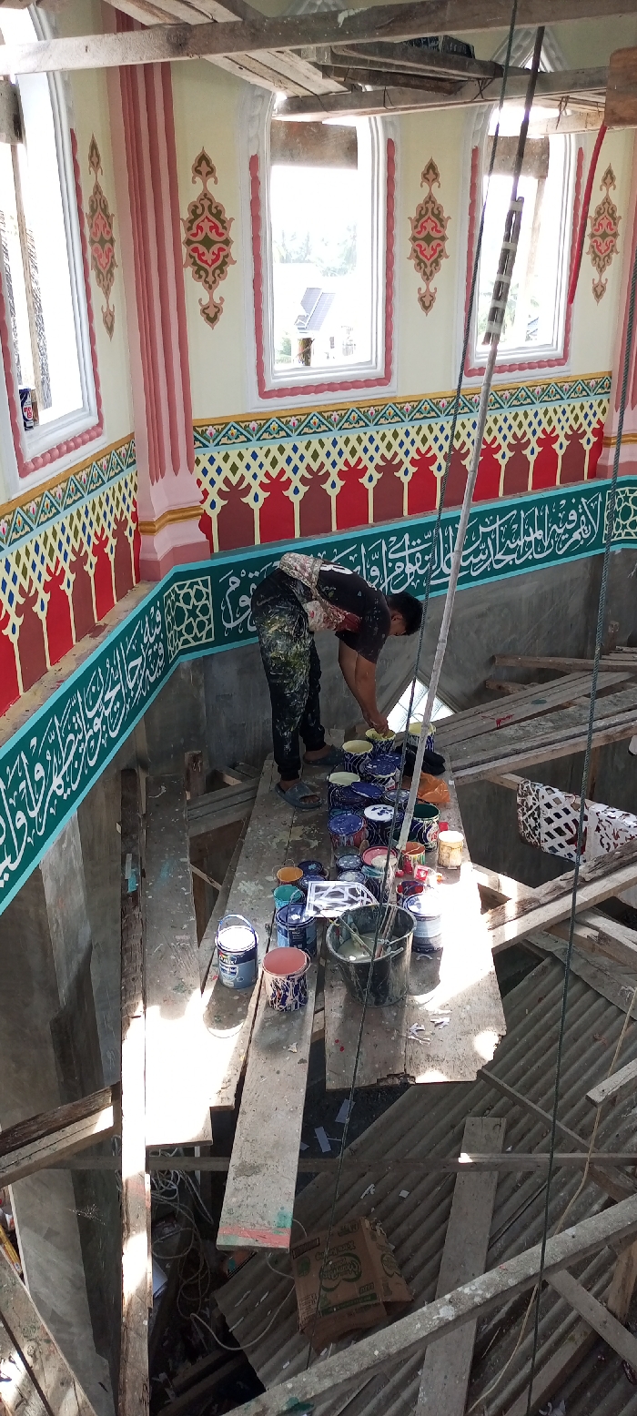 The image depicts an interior scene during construction or renovation in the city of Kumbang, Indonesia. A male individual is positioned on a makeshift wooden scaffold, actively engaged in painting or paint preparation. The individual, wearing a dark, paint-splattered t-shirt and similarly stained dark trousers and blue flip-flops, is bent over a collection of paint containers. A light-colored cloth or bandana is visible on his head. On the wooden plank scaffold around him are numerous paint cans and buckets of various sizes and colors, including several with blue and white patterns, a large white can labeled "Dulux," and a dark bucket containing brushes or stirring tools. Several stencils or templates are also visible on the scaffold. Above the scaffold, the building's walls are extensively decorated. The upper section features cream-colored walls with four arched windows framed in reddish-pink. Through the windows, distant trees and a building roof are visible under bright daylight. Between and below the windows are intricate red, green, and cream ornamental patterns. Below these, a horizontal band exhibits a repeating geometric design in yellow, green, red, and blue. Further down, a section of the wall is painted solid red with scalloped motifs. A prominent turquoise-green horizontal band with white Arabic calligraphy runs across the wall directly above the scaffold level. Below this, the wall is a plain light grey, appearing unfinished. Exposed wooden beams and structural elements are visible near the ceiling. Below the scaffold, a significant drop leads to a lower level of the construction site. This area contains additional wooden planks, corrugated metal sheets, a brown cardboard box, and loose ropes or cables. The scene is brightly illuminated by natural light entering through the windows, casting shadows on the scaffold and lower levels.