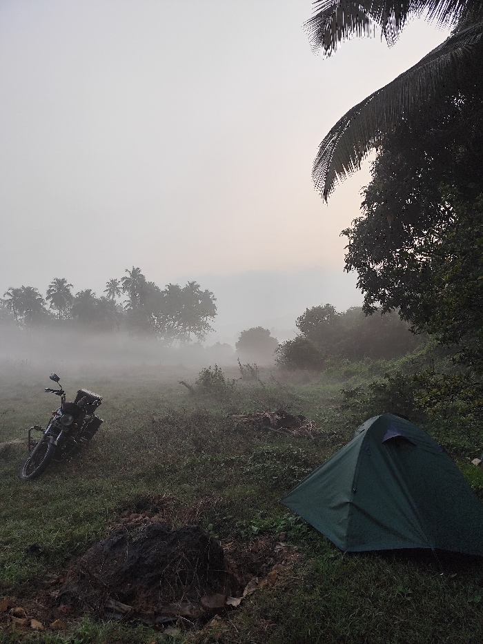 This image depicts a foggy outdoor scene in Querim, India, with camping equipment present