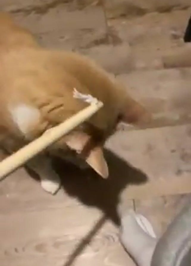 An orange and white cat is seen on a wood-look laminate floor, attempting to catch a stuffed toy frog. A white stick is used to drag the toy around for the cat. A person wearing gray sweatpants and a white sock is visible near the cat.