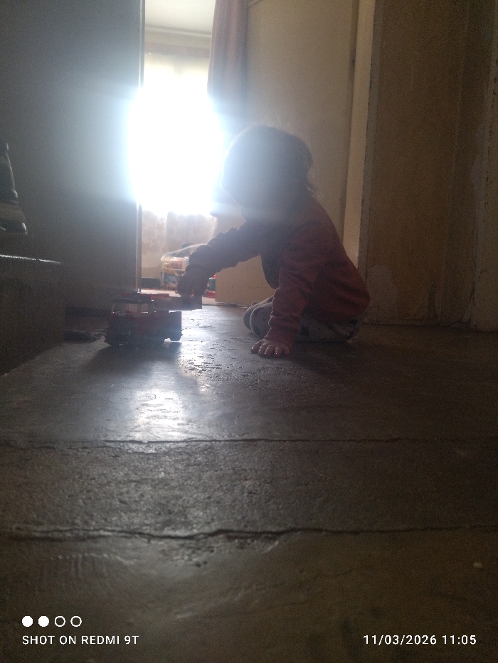 A young child is depicted indoors in Novi Iskar, Bulgaria, seated on a dark, cracked concrete floor