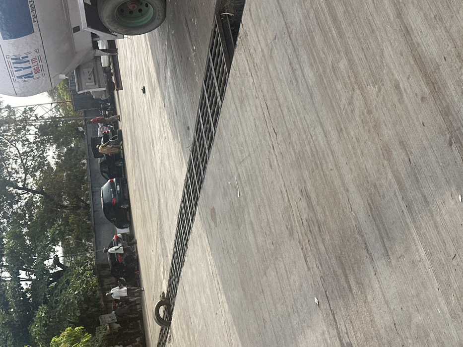An outdoor scene captured from an oblique angle showcases a mix of urban and natural elements. A drainage grate stretches across a concrete surface, adjacent to a tanker truck. Trees and parked cars line the side, with people seen standing near the vehicles. The composition features a blend of industrial infrastructure and everyday street life, offering a glimpse into a busy, possibly commercial area.