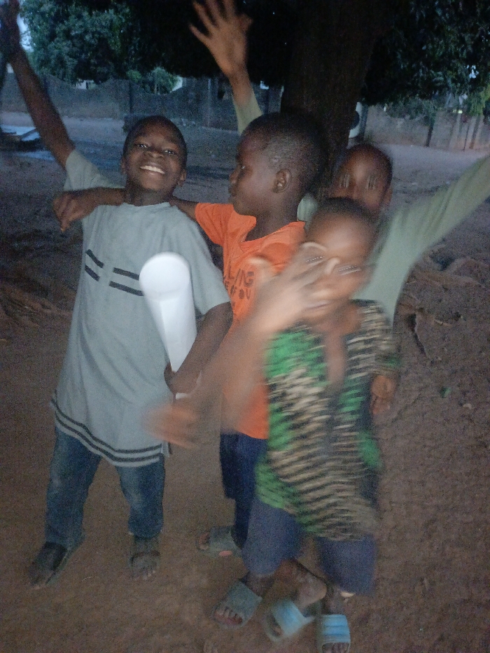 The image depicts four young individuals, likely children, gathered outdoors in Akwanga, Nigeria, under low light conditions, suggestive of dusk or night