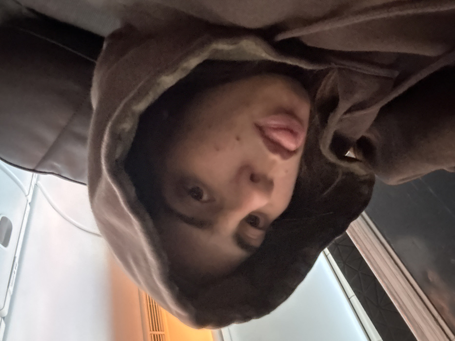 An individual is depicted in a close-up, eye-level shot within an aircraft cabin, likely at or in transit to/from Al Matar, United Arab Emirates. The person is wearing a dark brown hooded sweatshirt with the hood pulled over their head, partially obscuring dark hair. Their face is centrally positioned, with dark eyes looking directly forward. The mouth is slightly open, and the tongue is extended in a playful gesture. Several small dark spots are visible on the right cheek and nose. The background consists of interior aircraft elements: a light-colored overhead panel or light fixture in the upper left, a brown upholstered seat behind and to the right of the individual, and a ventilation grate to the lower left, beneath a light source emitting an orange hue, indicative of a window view or specific cabin lighting.